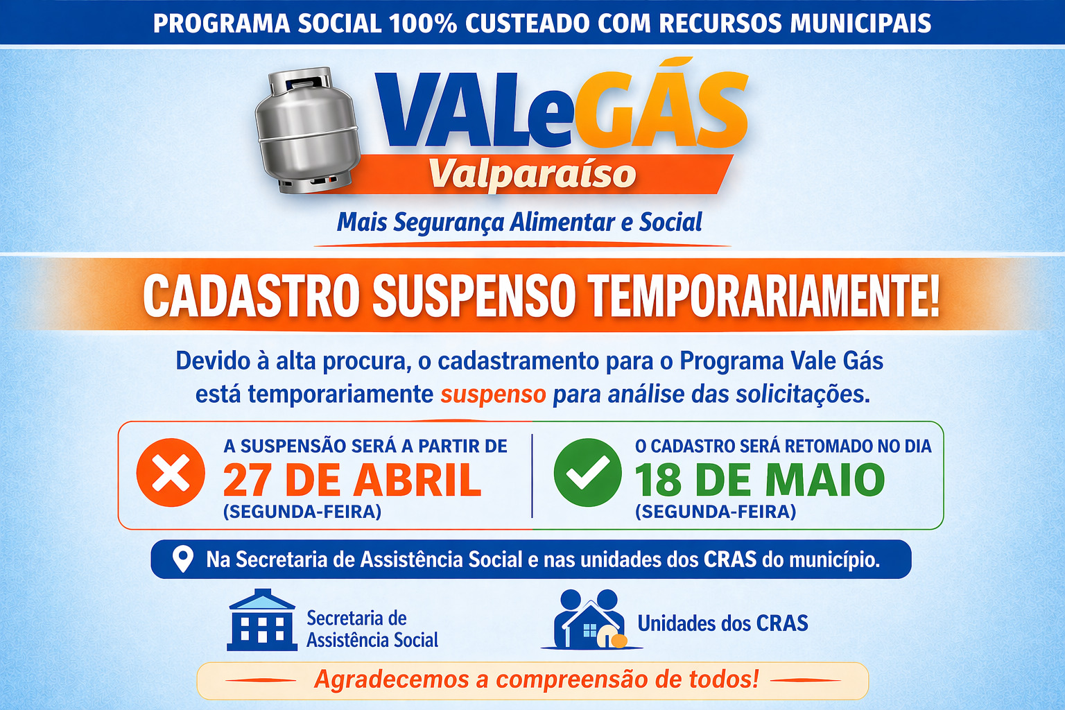 A Prefeitura de Valparaíso de Goiás, por meio da Secretaria Municipal de Assistência Social, informa que o cadastramento para o programa social Vale Gás está temporariamente suspenso a partir desta segunda-feira (27 de abril).