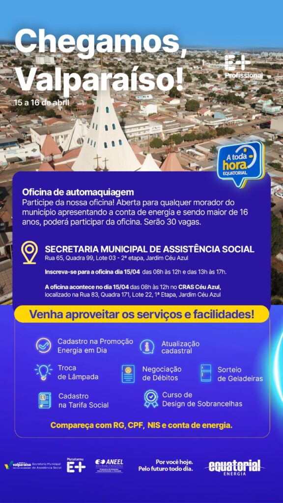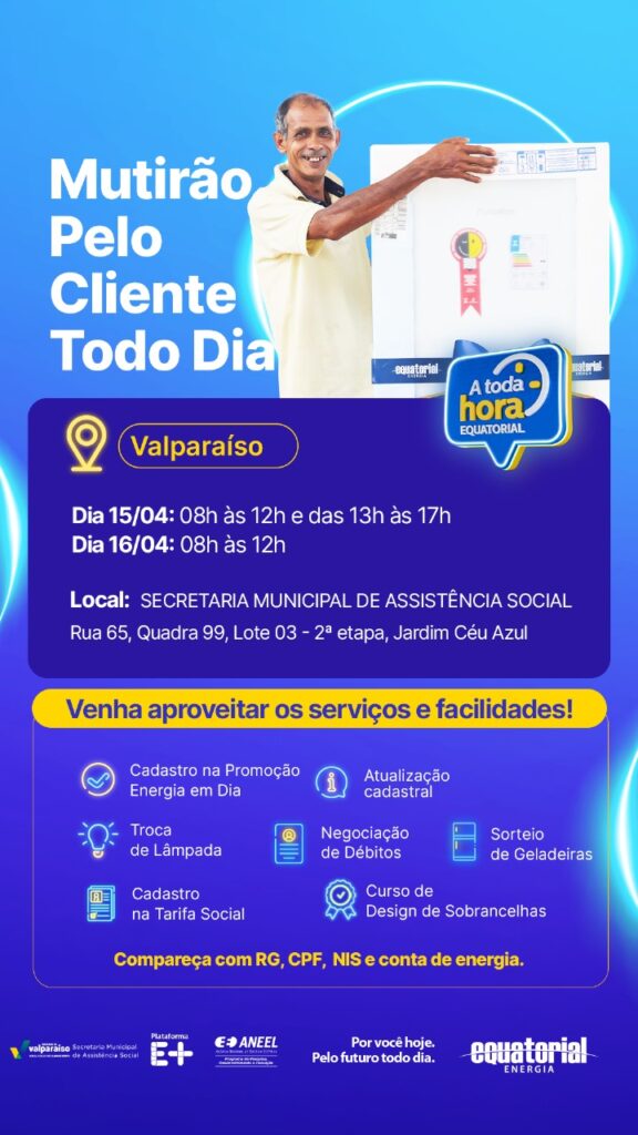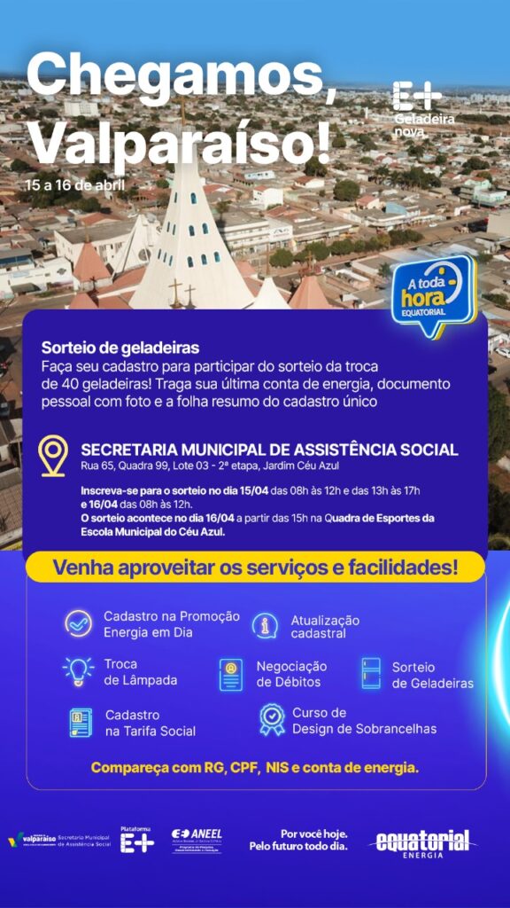 A Caravana da companhia de energia Equatorial está passando pela cidade de Valparaíso de Goiás nesta semana, em uma parceria com a Secretaria Municipal de Assistência Social. Durante os dias 15 e 16 de abril, serão realizados cadastros para sorteios e troca de geladeiras, além de troca de lâmpadas e inscrição para o curso de automaquiagem que será realizado no Centro de Referência de Assistência Social (CRAS) do Céu Azul.