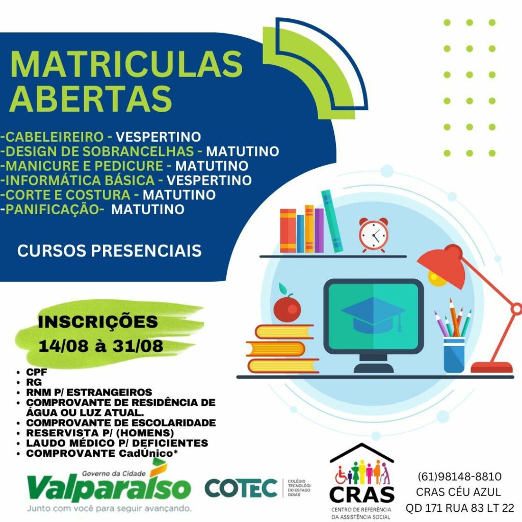 O Colégio Tecnológico de Goiás (COTEC), em parceria com a Secretaria Municipal de Assistência Social, está com inscrições abertas para os cursos gratuitos de capacitação profissional presenciais (matutino e vespertino) e online.