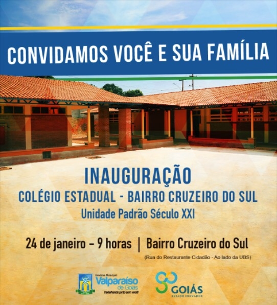 Nesta quarta-feira (24), às 09h, o Governo do Estado de Goiás vai inaugurar em Valparaíso de Goiás a Escola Estadual Cruzeiro do Sul. A instituição de ensino faz parte de uma série de unidades educacionais que atendem o modelo padrão século 21, que prima por proporcionar segurança e bem estar aos professores e alunos.