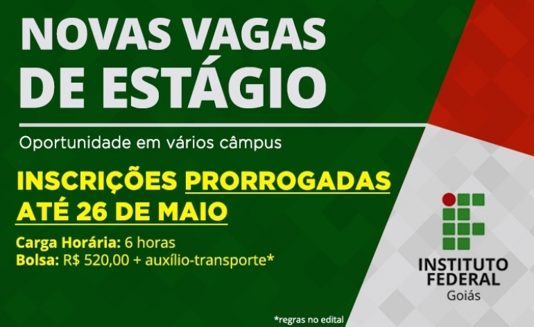 Estão abertas as inscrições para duas vagas de estágio (cadastro reserva) para o Câmpus Valparaíso do Instituto Federal de Goiás (IFG). Uma vaga é para a área de Psicologia e a outra para Administração. Para se inscrever, somente no Setor de Protocolo do Câmpus, até o dia 26 de maio. A bolsa será no valor de 520 reais mais auxílio-transporte (seis reais por dia estagiado). A carga horária será de 30h semanais. Para participar da seleção, o candidato deverá estar matriculado em curso de graduação correlato à área que pretende concorrer.