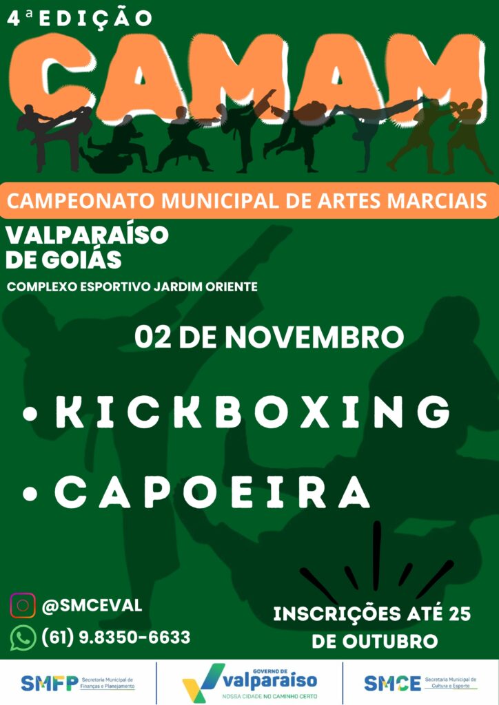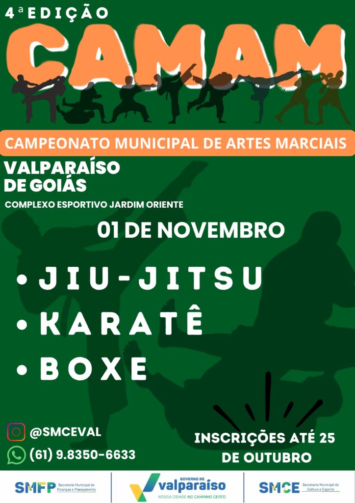 A Prefeitura de Valparaíso de Goiás, por meio da Secretaria Municipal de Cultura e Esporte, realiza a 4ª edição do Campeonato Municipal de Artes Marciais (CAMAM), entre os dias 31 de outubro e 2 de novembro, no Complexo Esportivo do Jardim Oriente.