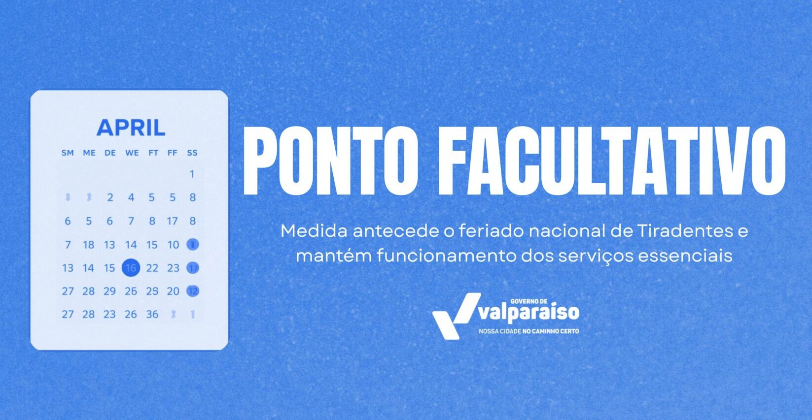 A Prefeitura de Valparaíso de Goiás publicou o Decreto nº 155, de 13 de abril de 2026, que estabelece ponto facultativo nas repartições públicas do Poder Executivo municipal no dia 20 de abril, véspera do feriado nacional de Tiradentes, celebrado em 21 de abril.