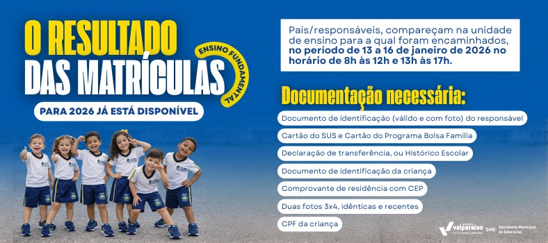 O processo da efetivação da matrícula somente será realizado, após o comparecimento dos pais/responsáveis (maiores de 18 anos), na unidade de ensino para a qual foram encaminhados, no período de 13 a 16 de janeiro de 2026 no horário de 08h às 12h e 13h às 17h, munidos de original e cópia dos seguintes documentos abaixo descritos: