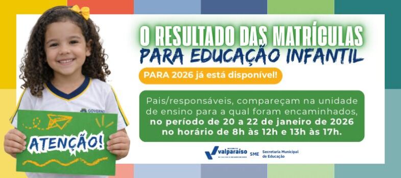 O Município de Valparaíso de Goiás, por meio da Secretaria Municipal de Educação, torna público o RESULTADO FINAL da Chamada Pública para o preenchimento de vagas da Educação Infantil.