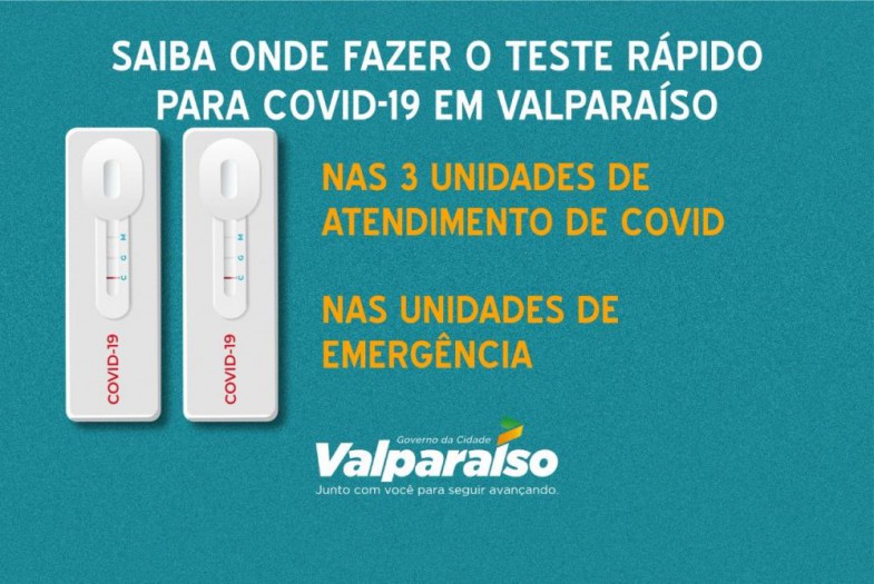 Portanto, o Governo da cidade de Valparaíso de Goiás, por meio da Secretaria Municipal de Saúde está disponibilizando testes rápidos (anticorpo/antígeno) em três unidades de referência de atendimento da Covid-19: UBS do Jardim Céu Azul, ESF Esplanada V, Unidade Jardins dos Florais; e nas unidades de emergência: Centro de Atendimento Integrado à Saúde (CAIS), Hospital Municipal de Valparaíso (HMV) e Unidade de Pronto Atendimento (UPA).