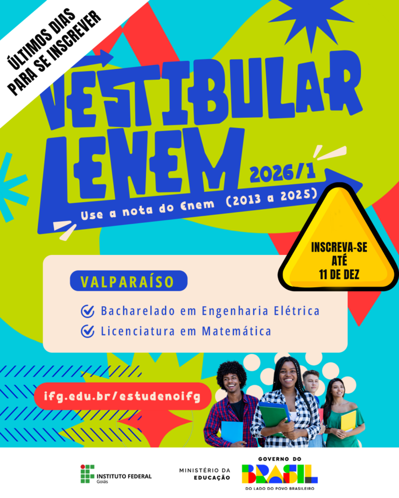 O Instituto Federal de Goiás (IFG) está nos últimos dias de inscrições para o processo seletivo Vestibular Enem 2026. Esta é a oportunidade para quem deseja iniciar uma graduação gratuita e construir uma nova trajetória profissional no próximo ano. As inscrições podem ser feitas até o dia 11 de dezembro, pelo site www.ifg.edu.br/estudenoifg, acessando a seção Vestibular.
