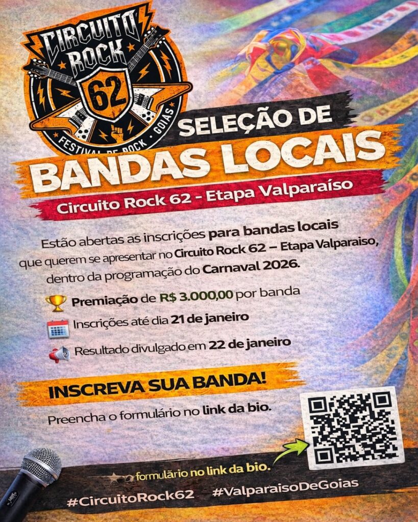 Atenção, bandas de Valparaíso de Goiás! Estão oficialmente abertas as inscrições para a seleção de bandas locais que desejam integrar a programação do Circuito Rock 62 – Etapa Valparaíso, que acontece durante o Carnaval 2026. A iniciativa valoriza os talentos da cidade e fortalece a cena cultural local, abrindo espaço para que artistas mostrem sua identidade, presença de palco e originalidade para um grande público.