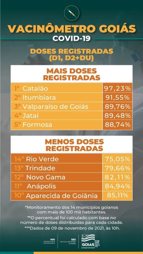 A Secretaria de Estado da Saúde de Goiás (SES-GO) divulgou os dados atualizados do vacinômetro de Goiás na última terça-feira, 09 de novembro. A publicação aponta Valparaíso de Goiás como terceiro, entre os 14 municípios com mais de 100 mil habitantes, com maior número de doses aplicadas.